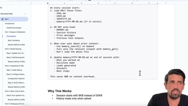 OpenClaw 的核心架構問題:每次訊息(包含心跳)都會載入全部 context files + session history。 隨著使用時間增長,context 從 50KB 膨脹到 75KB、100KB 甚至更大。作者透過 Slack 溝通時,發現系統把所有 Slack 歷史訊息(111KB 純文字)也一併送出。